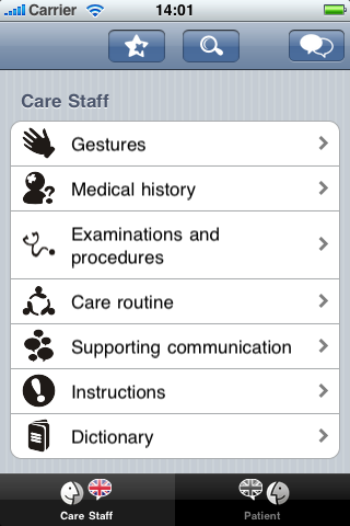 xprompt is simple, trustable and enables faster communication. Phrases are carefully grouped into themes and sections, with tailored menus for care staff and patient. xprompt provides 800 phrases in total for each language pack that can be freely combined.