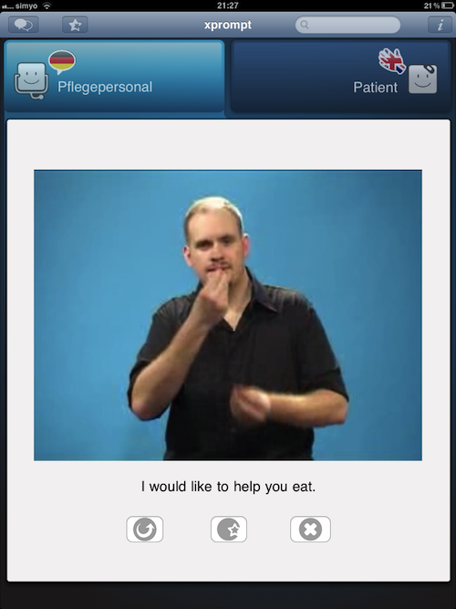 The phrases are translated into the text of the target language, together with a voice output for spoken languages or a video sequence if sign language is selected. The partner can respond by changing into his/her language mode, and choosing a response phrase. Thereby the iPad is used by both parties.